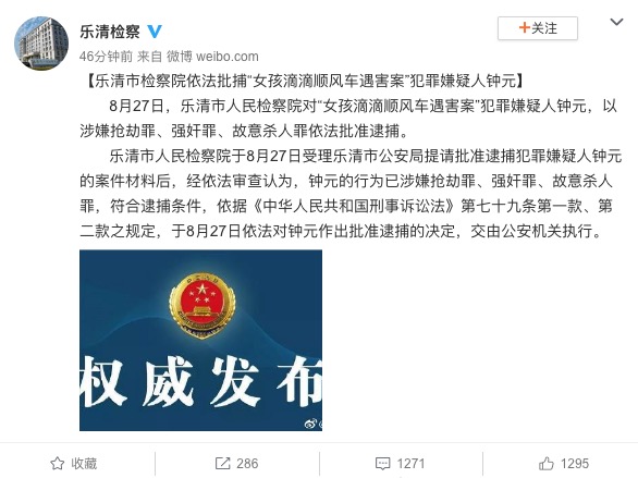 发布音讯称,检察院在 8 月 27 日对“女孩滴滴顺风车遇害案”犯罪嫌疑人钟元,以涉嫌抢劫罪、强奸罪、成心杀人罪依法批准拘捕。乐清市人民检察院 8 月 27 日受理乐清市公安局提请批准拘捕犯罪嫌疑人钟元的案件材料后,经依法检查以为,钟元的行为已涉嫌抢劫罪、强奸罪、成心杀人罪,契合拘捕条件,根据《中华人民共和国刑事诉讼法》第七十九条第一款、第二款之规定,于8月27日依法对钟元作出批准拘捕的决议,交由公安机关履行。