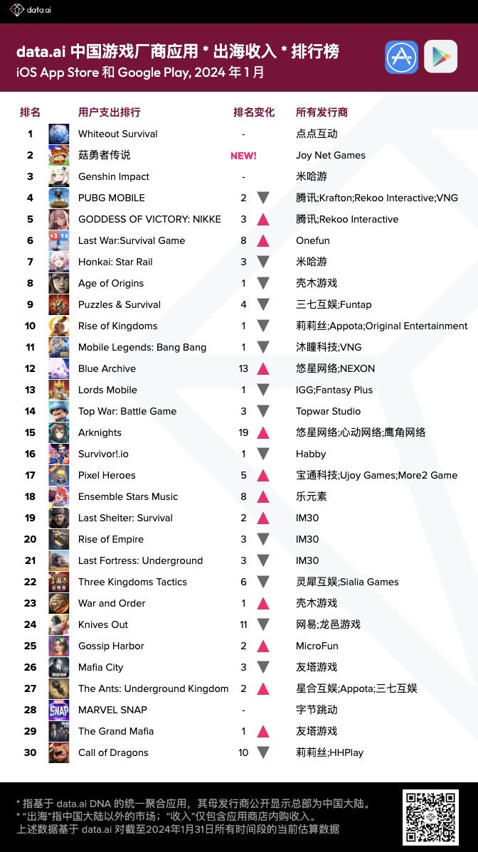 data.ai 发布了 2024 年 1 月我国游戏厂商及使用出海收入 30 强榜单,以下是具体内容: